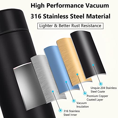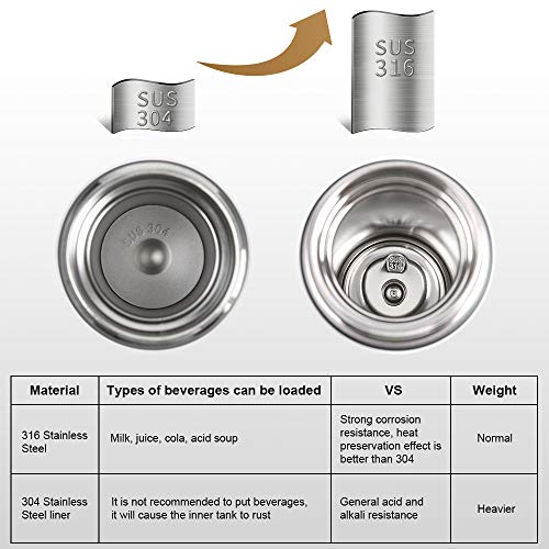 【316 VEILIGHEID EN GEZONDHEIDSMATERIAAL】: De binnenwand is gemaakt van 316 roestvrij staal en de buitenste behuizing is gemaakt van hoogwaardig 304 roestvrij staal. Het 316 materiaal kreeg een betere corrosiebestendigheid en oxidatiebestendigheidHet dan de normale 304. Het is goedgekeurd door de FDA voor uw drinkbehoeften. Natuurlijk bevat 100% geen BPA. (Maat: 6,5 cm * 6,5 cm * 23,3 cm)