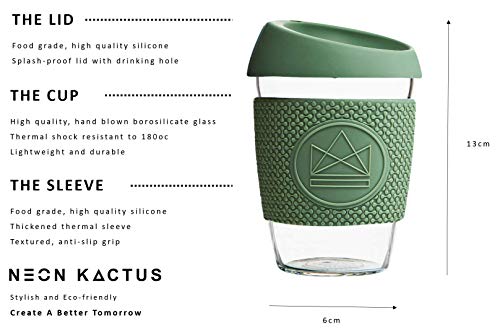 Specification: Neon Kactus Glazen koffiebeker | Herbruikbare glazen beker met deksel voor thuis of onderweg | Draagbare koffiekop | Voor warme en koude dranken | Duurzaam, niet-doorlatend, antislip, spatwaterdicht |